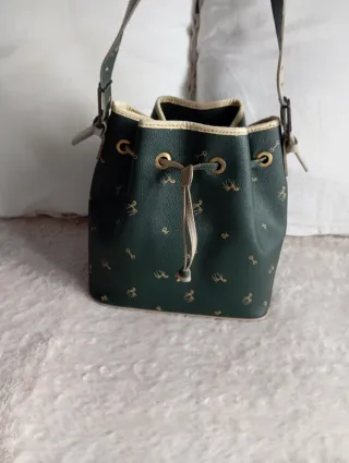 Bolso tipo cubo de la marca Petusco con un bonito estampado. - Color verde. - Estampado de figuras doradas. - Cierre con cordón. - Ribete superior en color beige.