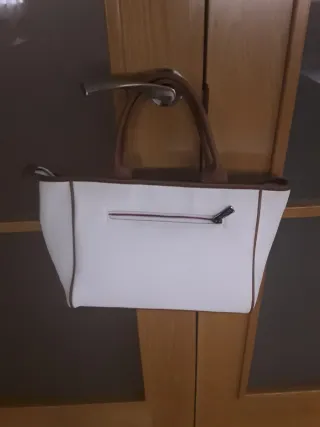 Bolso de mano y para colgar de la marca Amichi, con un diseño moderno y elegante. - Combinación de colores blanco y marrón. - Asa cómoda para llevar en la mano o al hombro. - Bolsillo exterior con detalle de perforaciones.