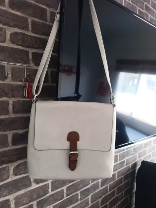 Bolso bandolera de estilo moderno con un diseño elegante. - Color blanco con cierre y detalle en marrón. - Correa ajustable para mayor comodidad. Nuevo sin usar.