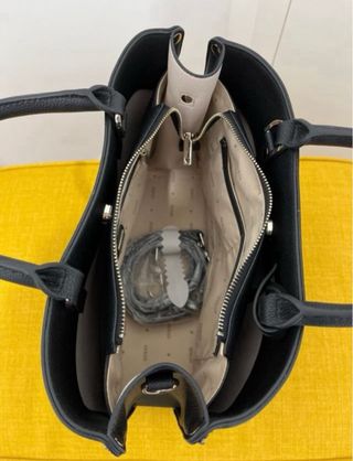 - Diseño elegante en color negro - Asas de tela a rayas. - Logo de la marca visible.