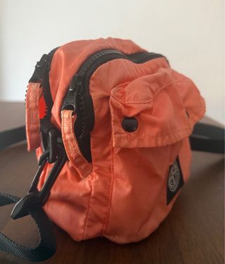 Bolso de la marca Stone Island en color naranja. Un accesorio práctico y con estilo. - Cierre principal con cremallera. - Bolsillo frontal con botón a presión. - Correa ajustable para llevar cruzado o al hombro. - Parche distintivo de la marca en la parte frontal. Perfecto estado. Original. Papales y etiquetas