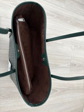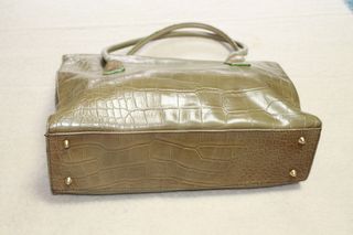 Marca: Cortefiel Material: sintético efecto piel de cocodrilo Color: verde/beige con detalles en contraste Asas de mano resistentes Tamaño medio, muy práctico y cómodo Base con apoyos metálicos para mayor protección Estado: en buen estado general, con ligeras señales de uso propias del tiempo (ver fotos). Estructura firme y funcional.