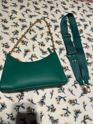 Bolso bandolera de la marca Mango en color verde. Incluye una cadena dorada y una correa ajustable. - Correa de tela verde. - Cadena metálica dorada.