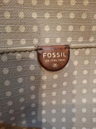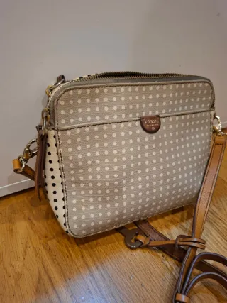 Bolso de la marca Fossil con un diseño de lunares. - Color principal beige / gris con lunares blancos. - Detalles y correa en color marrón. - Cierre de cremallera.
