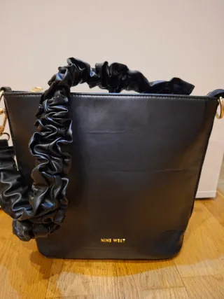 Bolso de mano Nine West en color negro. Diseño moderno y elegante. - Asa de mano con detalle fruncido. - Correa ajustable para llevar al hombro. - Logo de la marca en dorado.
