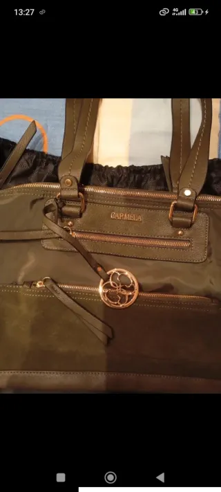 Bolso de la marca Carmela en un bonito tono verde oliva. Presenta un diseño moderno y práctico. - Material exterior de piel y tela. - Cierre principal con cremallera. - Bolsillo exterior frontal. - Asa de mano y correa ajustable para hombro. - Detalle de charm metálico colgante.
