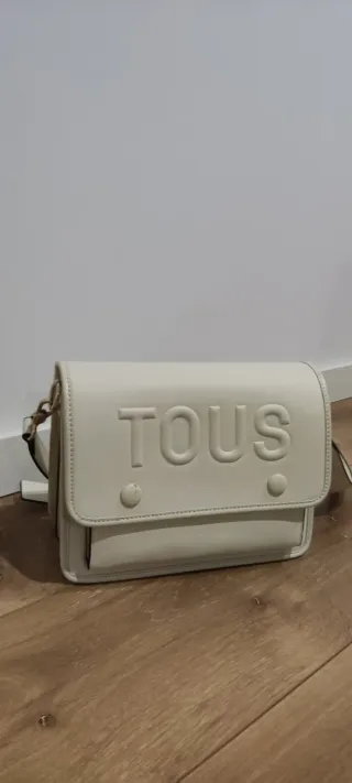 Bolso de la marca Tous en color beige y blanco. Diseño moderno y elegante. - Logo de la marca en relieve. - Cierre con solapa y botones. - Correa ajustable y correa corta Hay un pequeño defecto en el botón de la solapa.