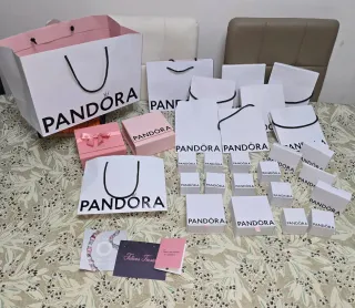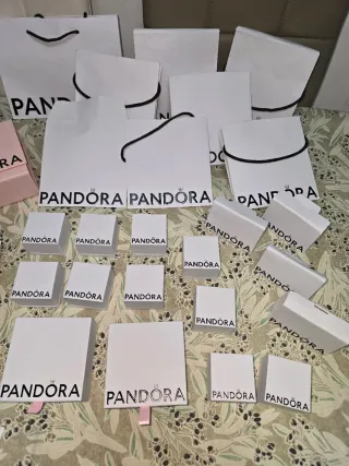 Lote de bolsas y cajas de regalo de la marca Pandora. Incluye varios tamaños y diseños, perfectos para presentar tus joyas. 10 bolsas,10 cajas para charms ,4 sacos de charms,certificado auténtico y tarjeta,2 cajas pulseras,2 cajas de regalo especiales rosa que valen 5 euros cada una - Variedad de bolsas de papel con asas. - Cajas de cartón para joyería. - Algunas cajas presentan un lazo decorativo.