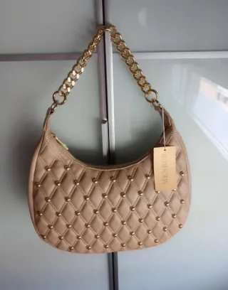 A estrenar! Elegante bolso con un diseño acolchado y detalles de tachuelas doradas. Su asa de cadena le da un toque moderno. - Diseño acolchado con patrón de rombos. - Tachuelas metálicas doradas. - Asa de cadena dorada.