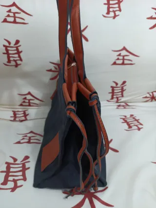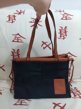 Bolso de mano con un diseño moderno y elegante. - Combinación de tela negra y detalles en piel marrón. - Asas largas para llevar al hombro. - Cierre con cordón ajustable en los laterales.