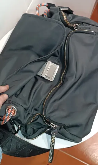 Bolso o mochila en color negro de la marca BIMBA Y LOLA. Cuenta con una correa ajustable y varios compartimentos. - Correa con logo de la marca. - Cierres de cremallera. - Detalle de tiradores en las cremalleras.