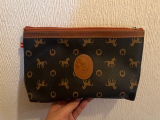 Bolso de mano con un diseño elegante y estampado de caballos y herraduras. - Cierre de cremallera. - Ribete y detalles en piel marrón. - Parche circular con el logo de la marca.