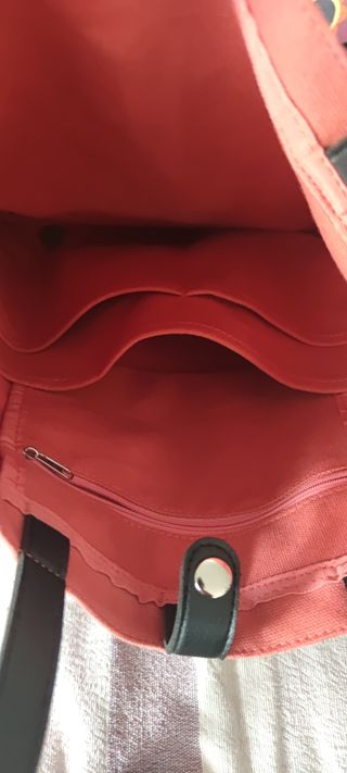 Bolso de la marca Caminatta con un diseño moderno y práctico. - Color marrón y rojo. - Compartimento principal con cremallera. - Dos bolsillos frontales con cremallera. - Tira ajustable para llevar al hombro. Buen estado pero tiene algunos roces por la parte de atras del uso