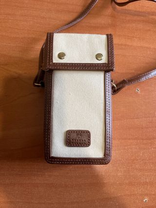 Bolso pequeño de la marca Teresa, ideal para llevar lo esencial. Combina tonos beige y marrón para un estilo clásico. - Cierre con botones a presión. - Detalle de logo en la parte frontal. - Correa ajustable para llevar al hombro o cruzado.