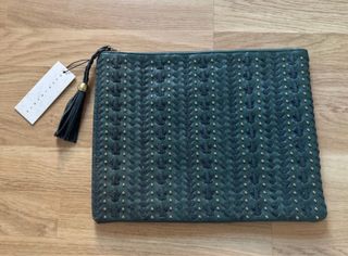 Elegante bolso de mano de la marca Tintoretto con un diseño tejido y adornado con pequeñas tachuelas doradas. Perfecto para complementar tu look. - Diseño tejido en zigzag. - Tachuelas metálicas doradas. - Cierre de cremallera.