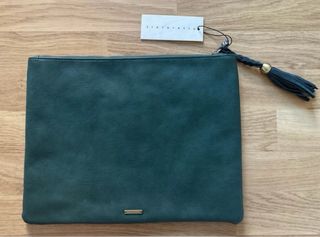 En tonos verdes y dorados, con flores en relieve. Es de piel de la marca luxax, medidas en las fotos.