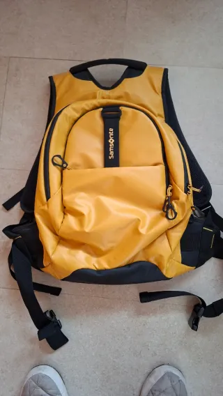 Mochila de la marca Samsonite en color amarillo. - Compartimento principal espacioso. - Bolsillo frontal con cremallera. - Correas de hombro ajustables. - Asa superior acolchada. SOLAMENTE USADA UNA VEZ