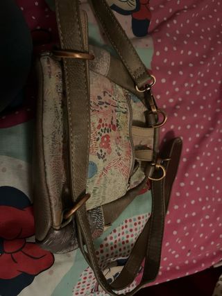 Bolso de la marca Desigual con un diseño llamativo. - Detalle de bordado en la parte superior. - Cremalleras decorativas y funcionales. - Adorno de cordones y cuentas. - Correas ajustables.