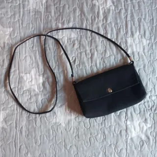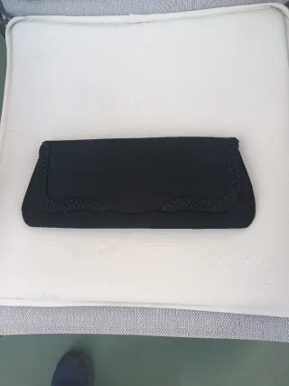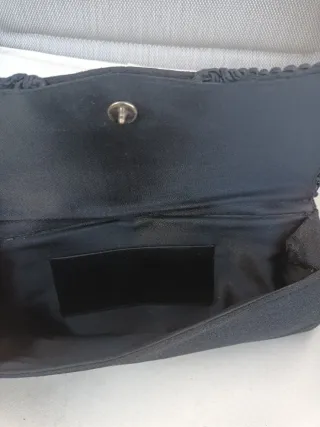 👛 Bolso pequeño, como de fiesta, color negro y de tela por fuera y por dentro de imitación piel color azul oscuro. Es básico, lo vendo porque nunca lo uso 😅