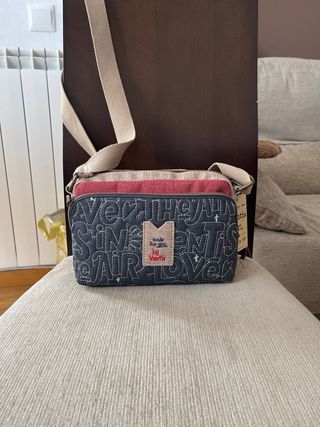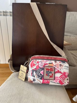 Bolso bandolera de la marca Ventis con un diseño vibrante y lleno de detalles. - Estampado collage con motivos de grullas, flores y frases. - Parche central con el logo Ventis Love is in the Air. - Correa ajustable de tela. - Cierre de cremallera.