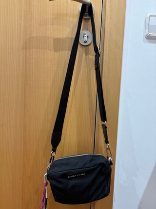 Precioso bolso bandolera de la marca Don algodón. Es de color negro con detalles rosas. - Asa de mano y asa larga regulable. - Bolsillo frontal con cremallera. - Cierre de cremallera principal. - Está en muy buen estado.