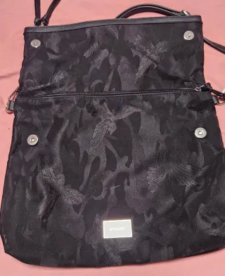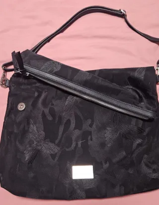 Bolso negro de la marca Desigual con varios compartimentos. Excelente estado general. Tiene el forro algo descosido de uno de los bolsillos exteriores pequeños(ver foto). Exterior perfecto. Muchos compartimentos. Poco uso. - Cierre principal con cremallera. - Bolsillos exteriores con cremallera y botón. - Correa ajustable para llevar al hombro o cruzado.