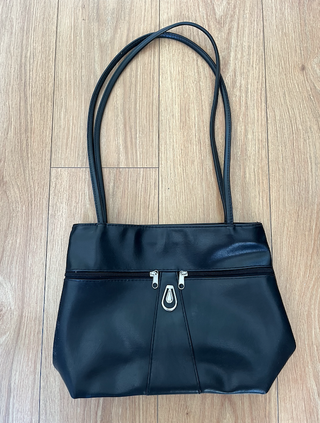 Bolso vintage de hombro en color negro, estilo clásico y elegante. Cuenta con dos asas largas para llevar cómodamente al hombro y múltiples compartimentos con cremallera. Interior forrado y con varios bolsillos. El bolso está en buen estado general, aunque presenta algunas marcas de uso en los laterales (visibles en las fotos). Cierre principal con doble cremallera y detalle metálico decorativo en el frente. ✨ Color: Negro ✨ Medidas: 35 X 26 X 9 / Asas 49cm de largo