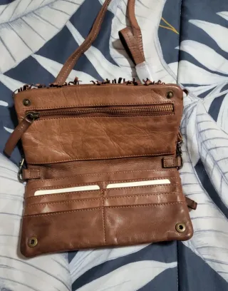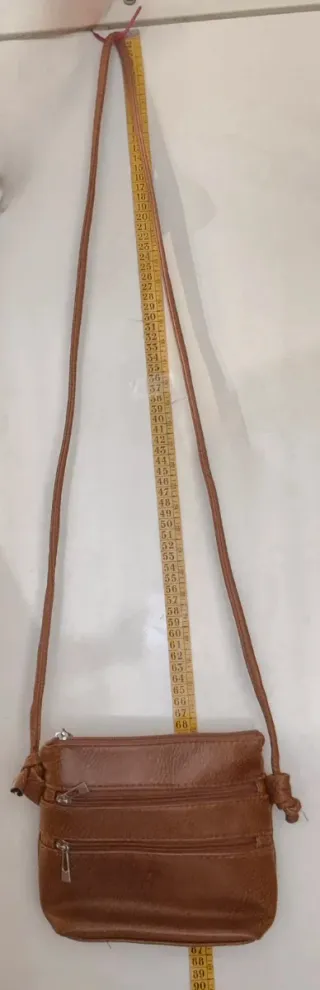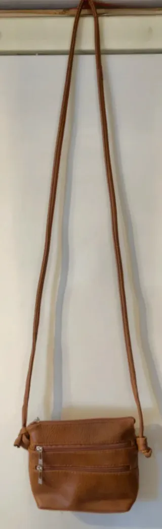 Bolsito de piel sintética en color marrón. Tiene una correa larga ajustable y varios compartimentos con cremallera. - Material: Piel sintética. - Color: Marrón. - Correa larga. - 3 compartimentos con cremallera.