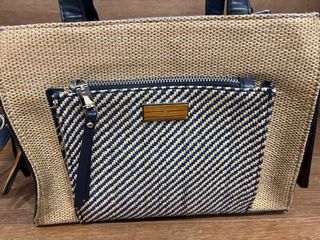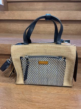 Apenas utilizado. Bolso de mano o bandolera de la marca Paco Martinez. - Diseño tejido en beige y azul. - Asa de mano y correa para llevar al hombro. - Bolsillo frontal con cremallera.