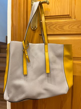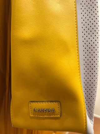 Bolso de mano o de hombro de la marca Carpisa, con un diseño moderno y llamativo. - Combinación de colores gris y amarillo. - Material con perforaciones. - Asas cómodas para llevar al hombro.