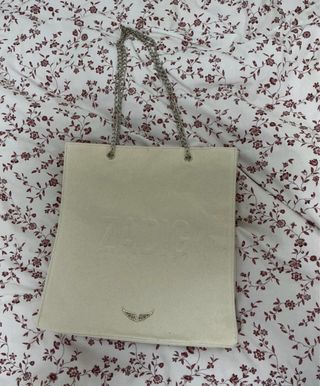 Bolso de mano Zadig & Voltaire en color beige. Cuenta con un diseño elegante y moderno, perfecto para complementar cualquier atuendo. - Asas de cadena plateadas. - Logo de la marca grabado en relieve. - Detalle de alas en la parte inferior. - Edición limitada