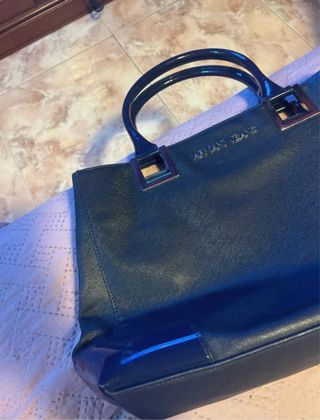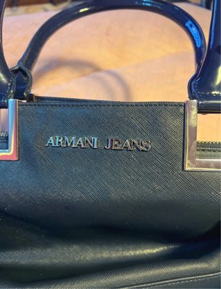 Elegante bolso de la marca Armani Jeans. - Diseño en color negro azul marino con detalles plateados. - Asa superior. - Cierre de cremallera.