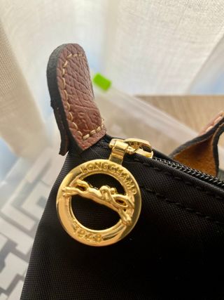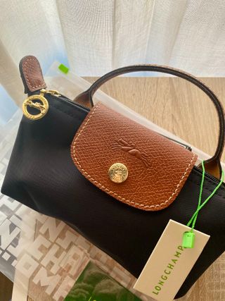 Bolso mini de la marca Longchamp. - Color negro con detalles en marrón. - Asa corta. - Incluye correa larga. - Cierre de cremallera. - Solapa con botón a presión.