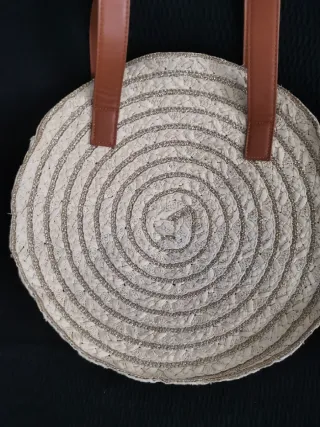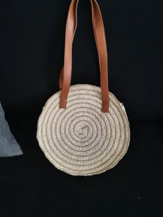 Bolso redondo de paja con un diseño de espiral y asas de cuero. - Material: Paja y cuero. - Color: Beige y marrón. - Diseño circular.