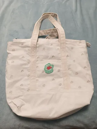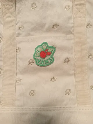 Bolsa tote de tela blanca de la marca Vans, con un divertido estampado de pequeños elefantes por toda la superficie. Aparche bordado de cerezas y el logo de Vans. - Material: Lona. - Color: Blanco y crema con estampado. - Cierre superior con cremallera.