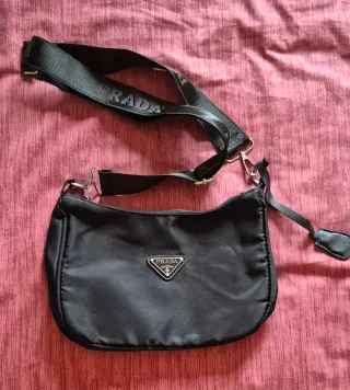 Elegante bolso negro de Prada, perfecto para el día a día. - Fabricado en nylon resistente. - Correa ajustable con el logo de la marca. - Incluye un pequeño asa adicional. - Detalle del icónico logo triangular de Prada en la parte frontal.