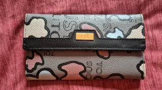 Billetera de la marca Tous con un diseño llamativo. - Estampado con el logo de la marca y ositos. - Combinación de colores gris, blanco, rosa y azul.