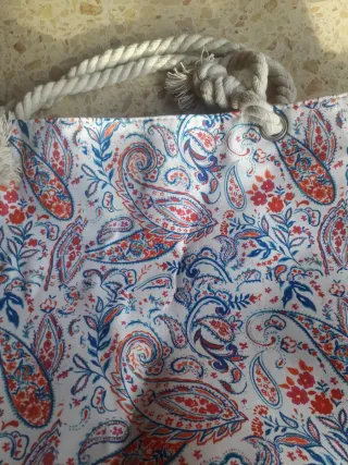 Bolso de playa con un diseño llamativo y asas de cuerda. - Estampado paisley en tonos rojos, azules y blancos. - Asas de cuerda gruesa. - Base de tela en color beige.
