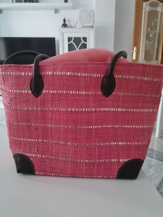 Precioso bolso de playa de color rosa. Es de rafia y tiene asas de cuero marrón oscuro. Está en muy buen estado. - Asa de mano. - Cierre superior. - Perfecto para el verano.