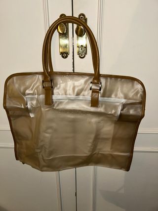Práctica bolsa de playa Kérastase, ideal para llevar tus esenciales. - Material transparente. - Ribete y asas en color marrón. Lavable Largo 45 cm. Alto 36 cm. ancho 27 cm. Cremallera en los dos sentidos. Preferiblemente entrega en mano, zona metro Goya en Madrid. También puedo activar el envío.