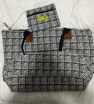 Conjunto de bolso de playa y neceser a juego con un diseño de cuadros. - Bolso espacioso. - Neceser con cremallera. - Diseño de cuadros en blanco, azul oscuro y negro.