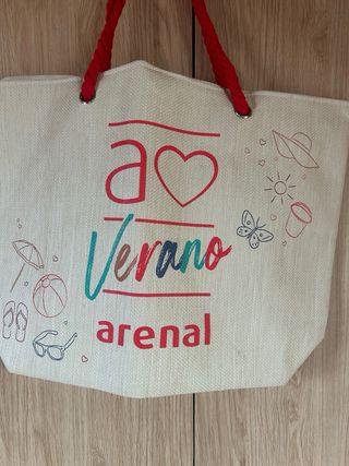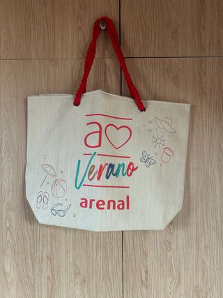 Bolsa de playa con un diseño veraniego y alegre. Perfecta para llevar todo lo necesario a la playa o piscina. - Diseño Verano Arenal con motivos playeros. - Asas de cuerda rojas. - Material de lona resistente.