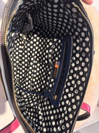 Bolso de playa tipo capazo con un diseño único. - Dibujado a mano con lunares de colores. - Asas de cuero marrón. - Forro interior con estampado.