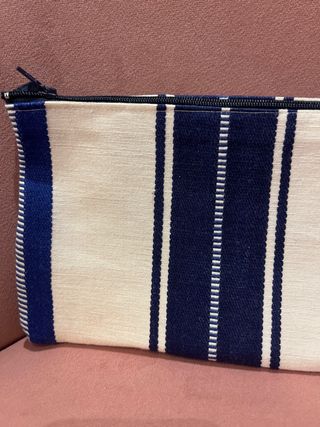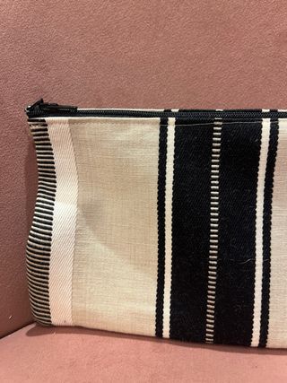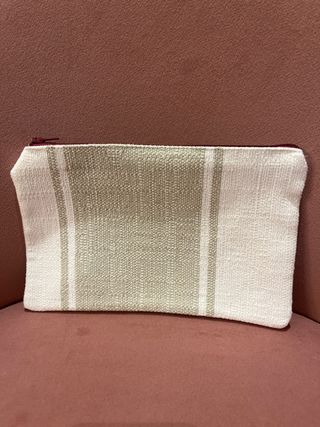 Pequeño bolsito hecho a mao , ideal para llevar lo esencial. Su diseño combina rayas beige y blancas con un cremallera burdeos. - Fabricado en 100% algodón. - Cierre de cremallera. - 21x15 cm Precio fijo. Gracias por valorar el trabajo a mano y la dedicación en cada pieza.