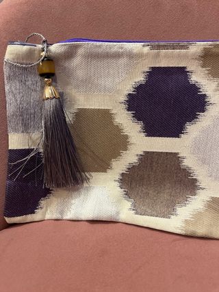 Pequeño bolsito hecho a mano , ideal para llevar lo esencial. Su diseño combina tonos morados y beige. - Tejido jacquard - Cierre de cremallera. - 37x20 cm - Adorno con borla Precio fijo. Gracias por valorar el trabajo a mano y la dedicación en cada pieza.