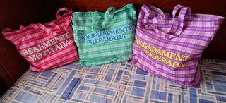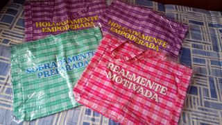 HAGO ENVÍOS. NO ACEPTO INTERCAMBIOS. Vendo por 50€ 4 bolsas tamaño maxi con estampado a cuadros: - 2 en tonos rosas, lilas y malvas, con el mensaje HOLGADAMENTE EMPODERADA. - 1 en tonos azules y verdes, con el mensaje SOBRADAMENTE PREPARADA. - 1 en tonos rosas y fucsias, con el mensaje REALMENTE MOTIVADA. El modelo es el mismo en los cuatro bolsos: tienen dos asas y buen tamaño, mucha capacidad. Pueden usarse como bolsos shopper o para la piscina o la playa ya que el material es algo impermeable. TOTALMENTE NUEVOS, SIN ESTRENAR. Puedo vender por separado a 15€ cada uno.
