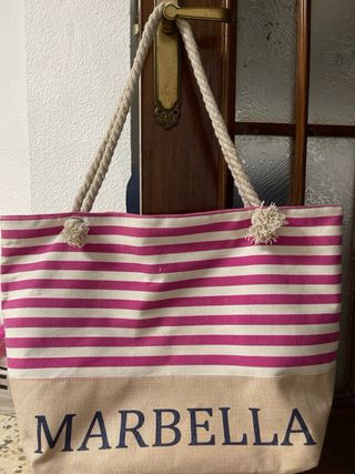 Precioso bolso de playa en tonos beige y blanco. Está prácticamente nuevo, sin apenas uso. - Diseño elegante y estilizado. - Asa de mano cómoda y resistente. - Perfecto para llevar a la playa o piscina.A 8 euros cada uno