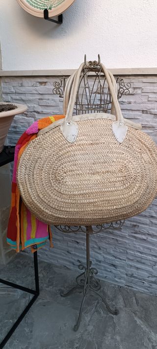 Bolso de playa estilo capacho, perfecto para llevar todo lo necesario. - Material de mimbre tejido. - Asas de cuero. - Diseño ovalado. Medidas 60 de ancho, tamaño familiar..