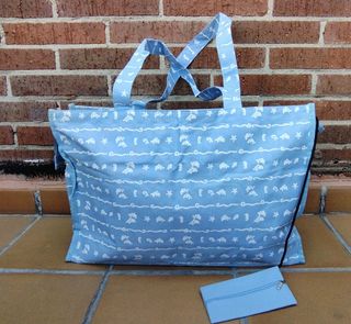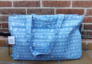 Bolsa de playa azul con motivos marinos. Dos compartimentos y carterita unida con una cuerda al interior de la bolsa. Medidas: largo 47cm, alto 30cm, ancho 12cm. Sin estrenar