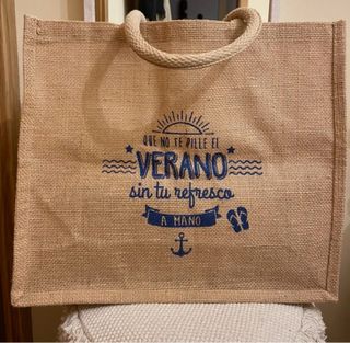 Bolsa de tela con diseño veraniego y frase Que no te pille el verano sin tu refresco a mano. - Material de yute. - Estampado azul con motivos marinos y sol. - Cierre no especificado. - Ideal para llevar tus esenciales a la playa o piscina.
